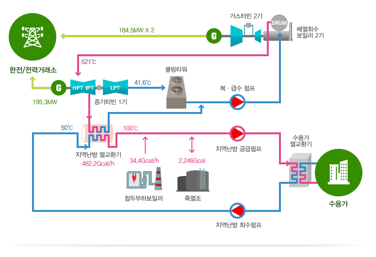열병합발전(CHP : Combined Heat and Power Generation)은 청정연료인 LNG를 연소시켜 전기와 난방열을 동시에 생산하는 고효율 에너지 발전 방식으로 기존 화력발전보다 에너지 이용 효율이 높습니다. 생산된 전력은 한국전력거래소(KPX)에 판매하며, 열은 지역냉난방 열원으로 공급합니다.